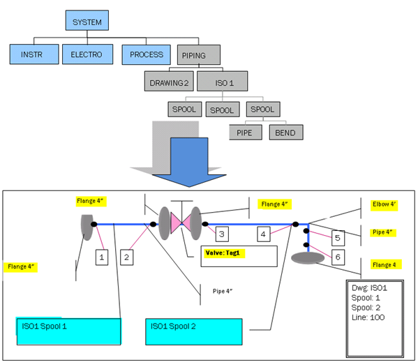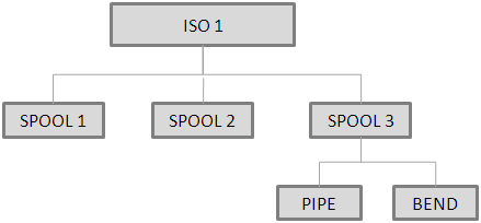 The picture above shows an Asset Design Piping System (ISO1), consisting of many assembly parts (SPOOL1, SPOOL2 and SPOOL 3). Each of these assembling parts have to be prefabricated by using the material demand in the BOM (PIPE and BEND). In other words, ISO 1 is assembled by Spool 1 and Spool 2 and Spool 1 is prefabricated using Pipe Part, Equal T Square and Flange. At the completion of prefabrication, the required number of spools is received to carry out the assembling and complete the isometric.