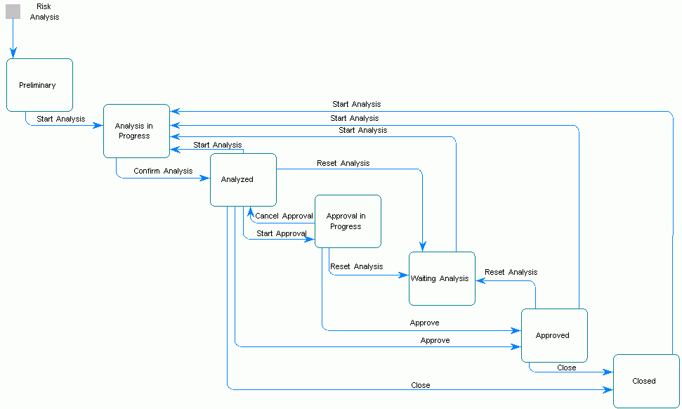 The Closed status is assigned to a risk analysis when it is believed to no longer pose any risk, or when the time period for the potential risk has expired. The risk analysis can be transitioned to the Closed status from either the Analyzed or Approved statuses, the latter being applicable if the approval of the risk analysis has been completed.
