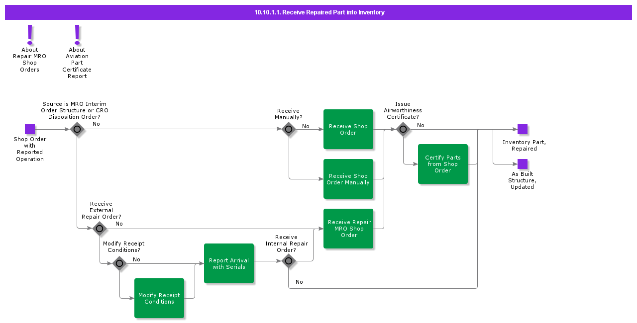 About Repair MRO Shop Orders Receive MRO Shop Order Shop Order Manufacturing Material History Shop Order Costs Shop Orders Costs MRO Interim Order MRO Interim Order Structure MRO Material Availability Receive Shop Order Shop Orders Shop Order Manual Issue Shop Order Material Line Shop Floor Workbench Shop Order Operations Reporting Report Arrival with Serials Register Arrivals Aviation Part Certificate Report Shop Order Part Certification Shop Order Disposition Shop Order Authorities Approvals per Maintenance Organization Form Types Airworthiness Regulation Codes per Form Type Airworthiness Regulation Codes Approvals per Authority Register Part Certificates - Batch Tracked Parts Register Part Certificates - Serial Parts Part Certificates Receive Shop Order Manually Shop Floor Workbench Receive Shop Order Manually Shop Order Shop Orders Shop Order Operations Reporting Shop Order Tracked Structure Modify Receipt Conditions Register Arrivals Certify Parts from Shop Order Shop Order Part Certification Receive Repaired Part Shop Floor Workbench Receive MRO Shop Order