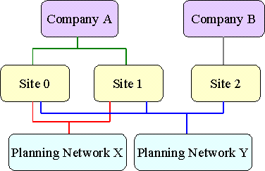 It is also possible to have a site in more than one planning network. For example, company A has 2 sites (0 and 1), and company B has one site (2). Network X can be set up to plan the Company A sites (0 and 1), and Network Y can be setup to plan all the sites in the internal supply chain (0, 1, 2). (See the example below).