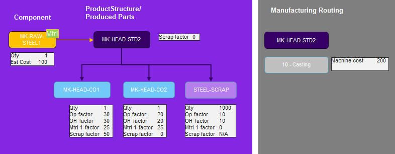 製造プロセスは 1 回の工程 (鋳造) で実行され、機械時間はわずか 1 時間、ワークセンタの原価は 200/時間で、諸経費はかかりません。