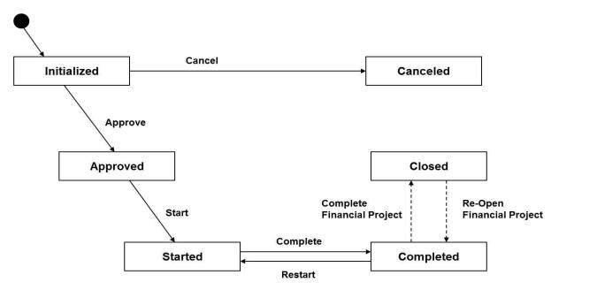 プロジェクトは必ず次のいずれかのステータスになります。作成、承認済、開始、完了、クローズまたは取消済。下の図は、プロジェクトの考えられるステータスとステータスの変更を示しています。