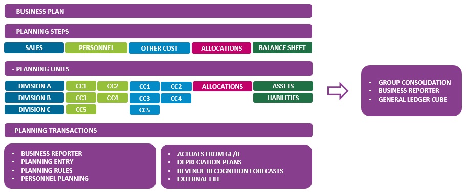 If there is a one-to-one relationship between the business plan and a reporting entity, the transfer to group consolidation is done in a similar way as reporting a budget version.