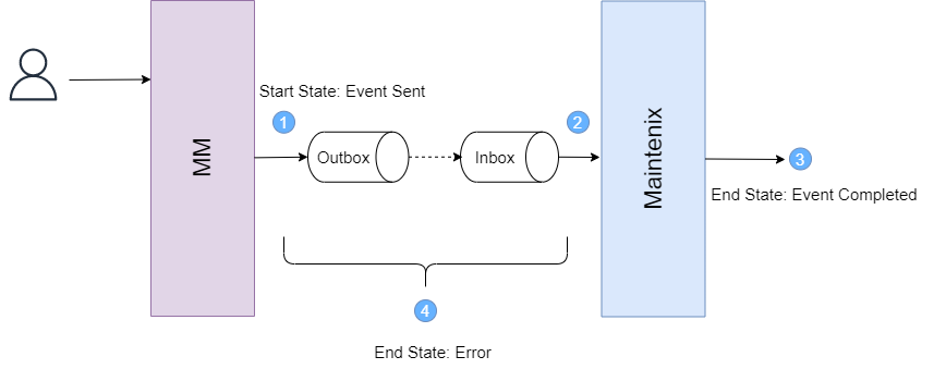 Using the communication between Mobile Maintenance (MM) for Aviation and Maintenix services as an example, the following diagram highlights the key communication stages in an Event pattern. Each stage will appear as a log record in the Communication Log.