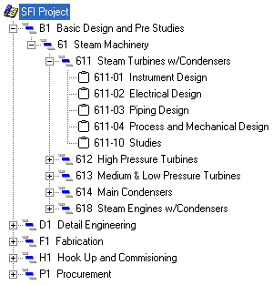 In this example, SF1 is the Project and includes three levels for the sub-project. The first level of the sub-project incorporates, for example, Basic Design and Pre Studies (B1), Detail Engineering (D1) and Fabrication (F1). At the second level we have Steam Machinery (61) and the third level will have, for instance, Steam Turbines w/Condensers (611) and High Pressure Turbines (612). The activities for the 611 sub-project are Instrument Design (611-01), Electrical Design (611-02), Piping Design (611-03), Process and Mechanical Design (611-04), and Studies (611-10).