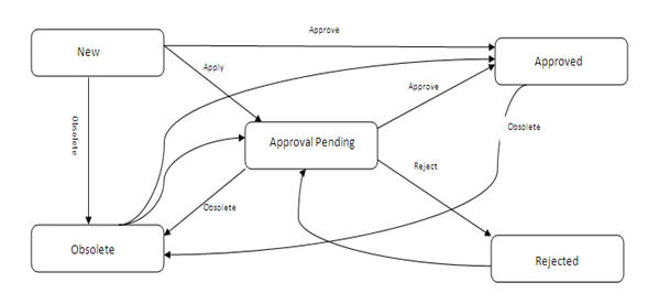The approval can be for different types of objects or for a single type of object, and it can be for any level of work to be carried out. It is also possible to record the current state of an approval by using the available Status feature. The valid statuses can be used to indicate whether the approval certificate is pending approval, approved, rejected or obsolete. Since it is possible to reapply an obsolete approval, the Status feature provides support to move the obsolete approval back to either the approval pending or approved statuses provided that all data is valid. Note that only certificates that are in the Approved status will be valid for generation. Following is a diagram of the relationships between the different approval statuses: