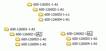 In the new revision (A2), the parent document (600-126001-1-A1) is moved to the new structure. The subdocuments (600-126003-1-A1 and 600-126004-1-A1) are also copied over to this new structure. In the old revision (A1), the parent document (600-126001-1-A1) has been disconnected and the original subdocuments remain.