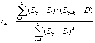 For parts that have over 2 years with demand, we compute the autocorrelation factor of the demand. The autocorrelation factor of lag equal to the number of periods per year,12 (if a monthly period is used). This lagged autocorrelation factor is compared to a limit, to get 85% accuracy the formula 1.05/sqrt(number of demand periods). The number 1.05 (see a normal curve distribution table) gives 85 % accuracy, to change the accuracy look at a normal distribution table and find the number for the wanted accuracy and use that instead of 1.05. Below are the formulas.