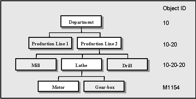 If you want to register a serial as a subordinate to an object 10-20-20 (Lathe), it should be given a suitable object number. This identity number, e.g., a motor M1154, indicates a specific motor. The number on the other hand, does not indicate a fixed place in the facility, and the serial object is only temporarily connected to that place in the structure. See the diagram of a four-level structure.