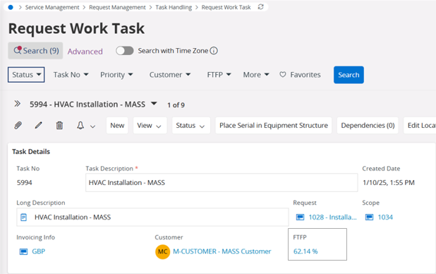 Prediction Example: The AI model uses the input attributes to predict the likelihood of resolving the task on the first visit. The model returns a First Time Fix Prediction (FTFP) score of 79.42%, indicating a high probability that the task will be completed successfully on the first attempt.