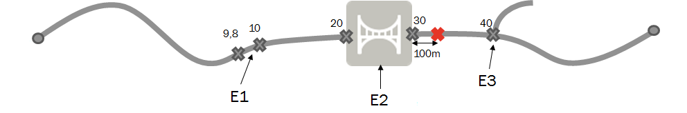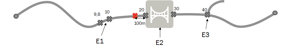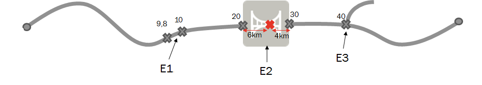 Example 3 - The maintenance work is on the bridge (E2) 4 km before the end facing the exit road (E3) (or 6 km