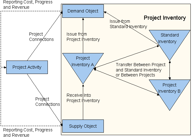 A supply that is directly connected to a project activity will be received into project inventory. Project-connected supplies are either created from project-connected demands or via manual activity connections. In comparison, a supply that is not connected to a project activity will be received into standard inventory.