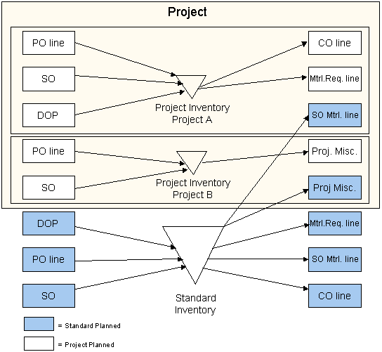 The figure below illustrates the flexibility of the project inventory concept. The picture includes two