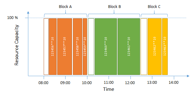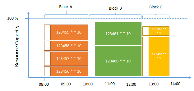 For work centers where the resource filled with multiple operations are executed simultaneously, such as ovens, the resource share is used to determine how many operations can be included in a block. A block resource share reaching 1 indicates that the resource is full, and no more operations should be connected to it. For work centers where operations are executed in sequence, the resource share is normally not relevant.