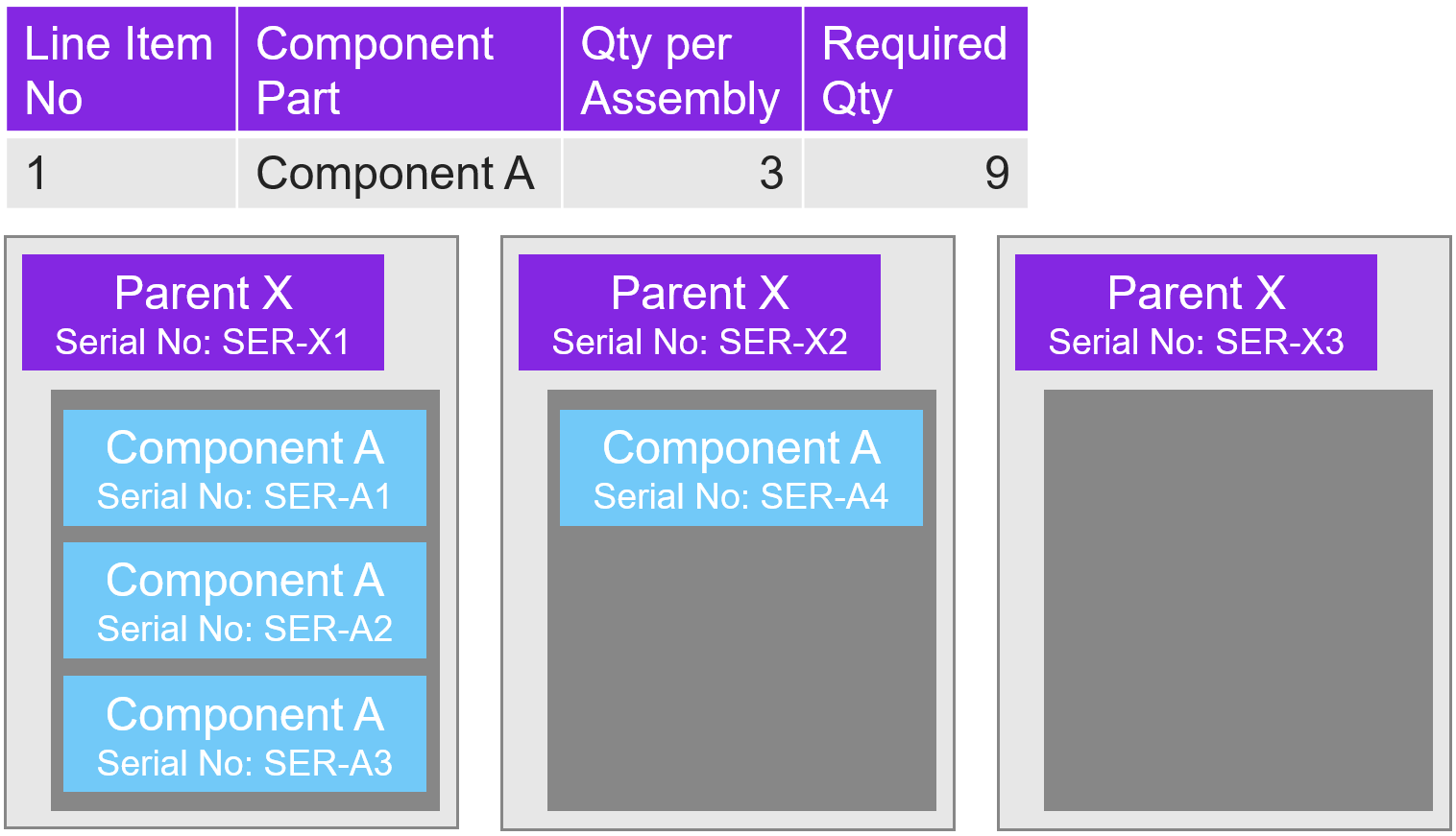 Three units of serial tracked parent part X are produced on a manufacturing shop order. The shop order has two material lines. The first material line is for serial tracked component A and has quantity per assembly set to 3. The second material line is for serial tracked component B and has quantity per assembly set to 1. When the tracked structure is built as displayed in the picture below, only the second parent is validated as complete. Note that the quantity of component A, three units, that is assigned to the second parent is equal to the quantity per assembly of component A multiplied by the quantity of the second parent (3 * 1 = 3). The quantity of component B, one unit, that is assigned to the second parent is equal to the quantity per assembly of component B multiplied by the quantity of the second parent (1 * 1 = 1).