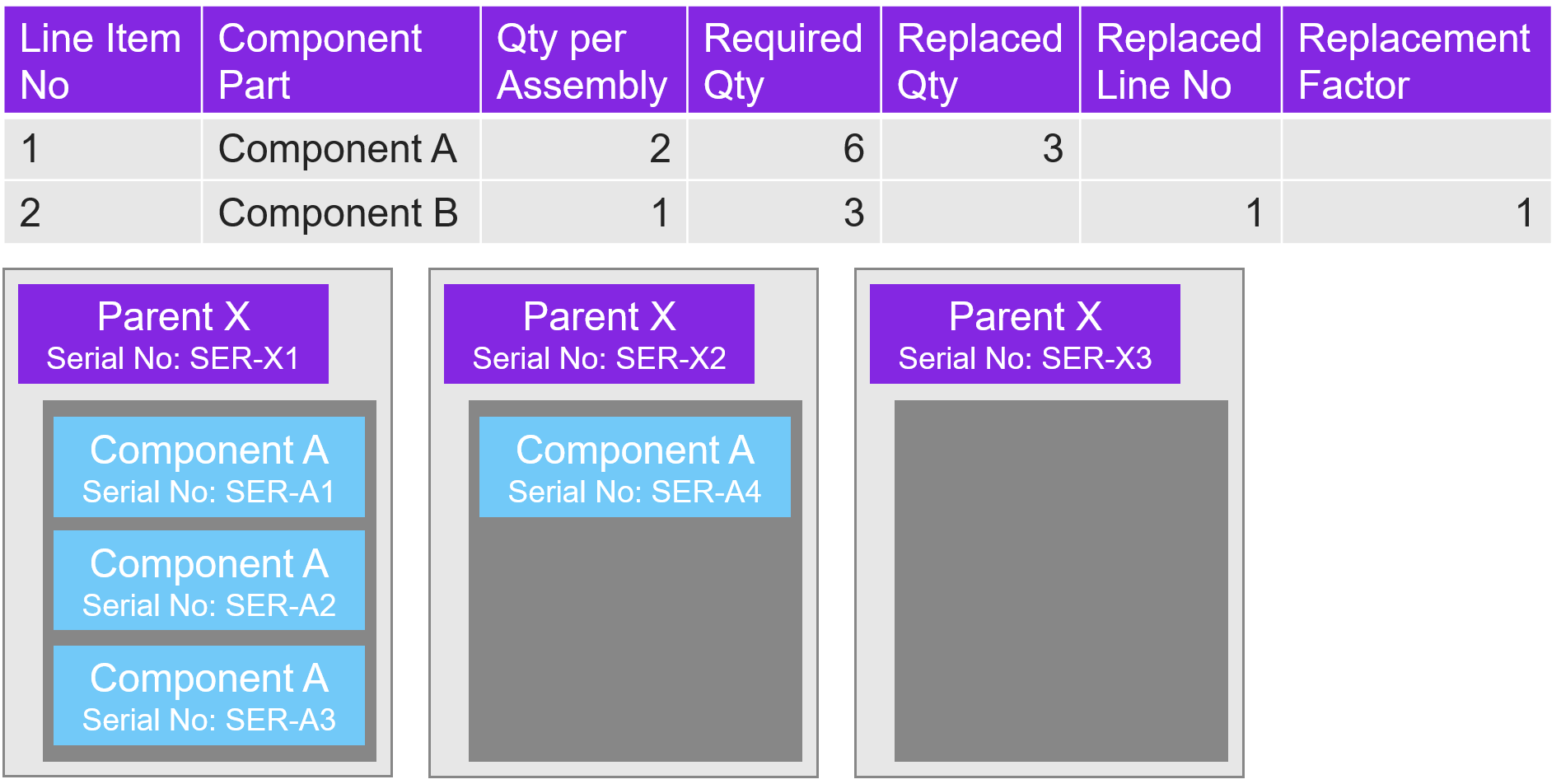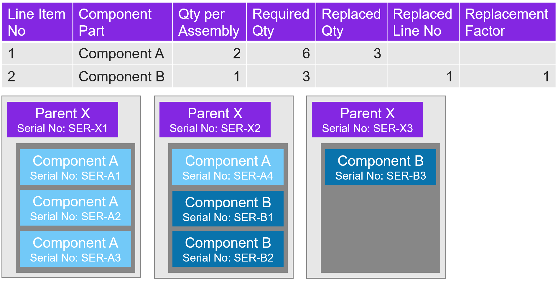 Three units of serial tracked parent part X are produced on a manufacturing shop order. The shop order has two material lines. The first material line is for serial tracked component A and has quantity per assembly set to 2. The second material line is for serial tracked component B and has quantity per assembly set to 1. The second material line was created when three units of component A on the first material line were replaced with three units of alternate component B. When three serial numbers for parent part X have been reserved and four units of component A have been reserved/issued, the automatically generated shop order tracked structure will be built as displayed in the picture below. Note that the system first assigns three units of component A to the first parent, that is equal to the sum of the quantity per assembly for the main component A and the alternate component B multiplied by the quantity of the first parent ((2 + 1) * 1 = 3), before continuing to assign anything to the next.
