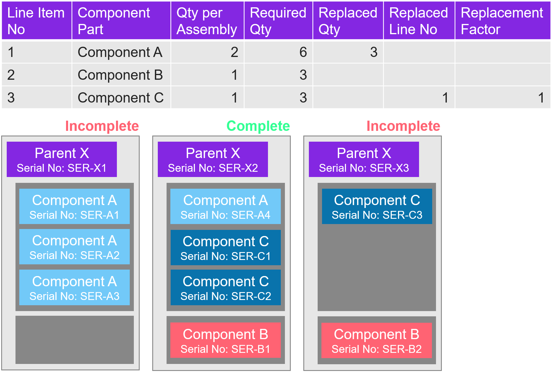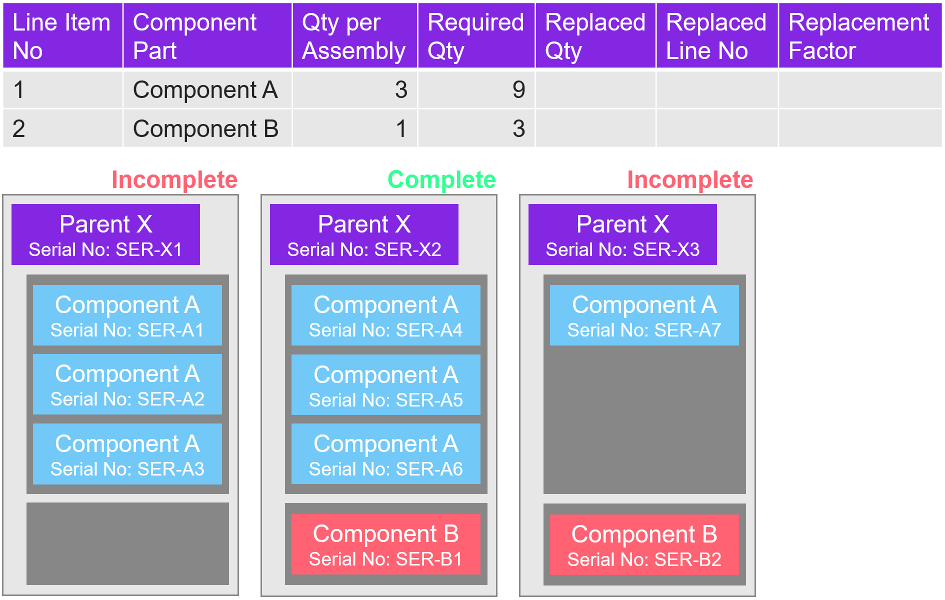 The tracked structure of a specific serial or lot/batch number on a shop order is validated as complete if enough quantity of all the components has been assigned to it. The component quantity assigned to the parent must be equal to the quantity per assembly of the component multiplied by the quantity of the specific parent. However, if a component has been replaced with alternate component(s), the sum of the component and alternate component(s) quantities assigned to the parent must be equal to the sum of the quantity per assembly of the main and alternate component(s) multiplied with the quantity of the specific parent.