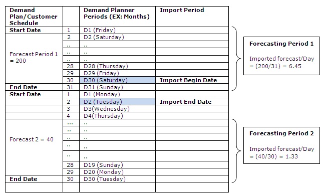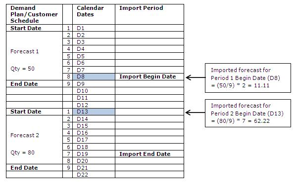 The Exported Forecasts or Customer Schedule includes columns for Start Date and End Date. The dates in these columns may be different from the Begin Date and the End Date that you entered in Import Demand Planning Forecasts or Import Customer Schedules. When this occurs, the system calculates the forecast quantity using the formulas shown below.