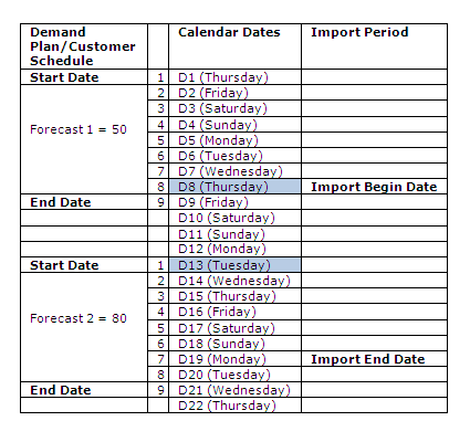 | Begin Date and End Date | The dates that you enter in the Import Demand Planning Forecasts or Import Customer Schedules to indicate the time span for which you want to import forecasts. |