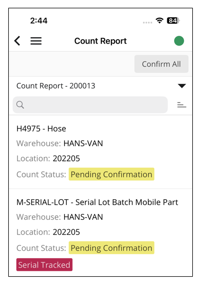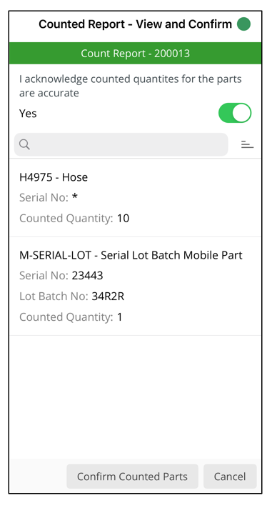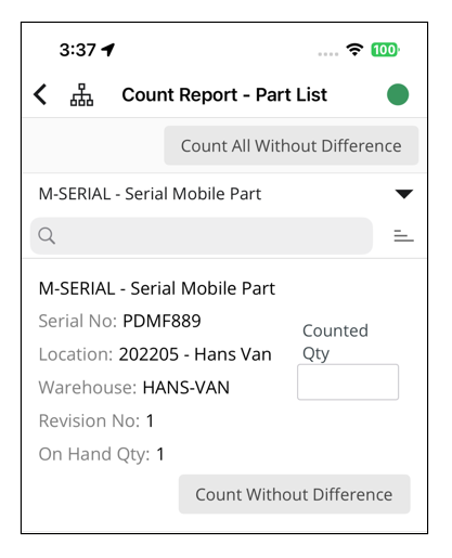 This is how Count Report - Part List appears on the mobile client: