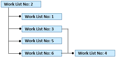 Note: You cannot delete work list lines that act as dependencies. For instance, in the above example, work list numbers: 2, 3, and 6 cannot be deleted. You will have to remove the dependency in order to delete the work list lines. Furthermore, you cannot create relationships that loop. For example, work list no: 1 cannot be included as the dependency of work list no: 2. To do so, you will have to remove the dependency and re-define it. Also, you cannot include work list no: 4 as a dependency to work list no: 2 , since work list no: 2 is an indirect dependency of work list no: 4.