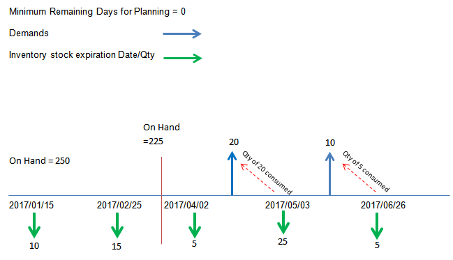 Before inventory stock gets expired it will be consumed by demands fall before the expiration date. This is also affected by the Minimum Remaining Days for Planning, if such stock is remaining even after consumed by demands, the remaining qty will be expired and will be visible in IFS application as a demand with an MRP source type MRP Inventory Lot Expiration. These demands are only visible and reduce the projected on hand qty by remaining qty to be expired on that particular date