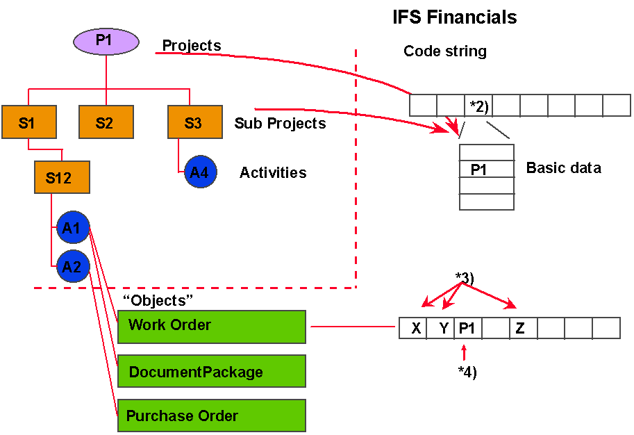For connected objects, preposting will insert the first sub project's code string or, if none is found, the project’s code string from *2 into *4. Companies and alternative code parts must be registered in IFS Financials. Once this is done, you can fill in the desired values for the code parts and build your own code string which can be used for preposting the project and/or sub project. All objects connected to a project should take advantage of this project-specific code string information.