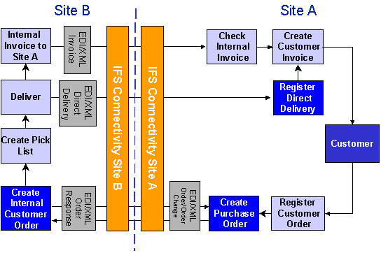 Der Ausgangspunkt kann ein Kundenauftrag, eine Bestellung oder ein Umlagerungsauftrag sein. Diese Aufträge wiederum können zum Beispiel von einem Planungswerkzeug erstellt werden. Wenn der Ausgangspunkt ein Kundenauftrag oder eine Bestellung ist und IFS Connectivity verwendet wird, werden verschiedene Nachrichten zwischen den beiden Standorten gesendet. In diesem Dokument werden die Nachrichten beschrieben, die in einer standortübergreifenden Handelssituation verwendet werden können, wenn der Ausgangspunkt einer der folgenden Aufträge ist:
