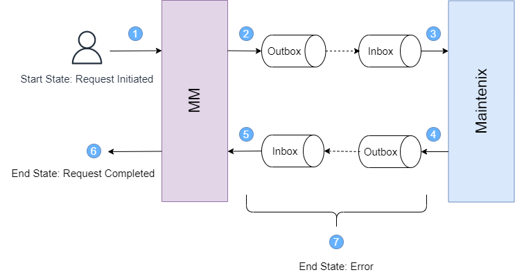 Using the communication between Mobile Maintenance (MM) for Aviation and Maintenix services as an example, the following diagram highlights the key communication stages in an Event pattern. Each stage will appear as a log record in the Communication Log.