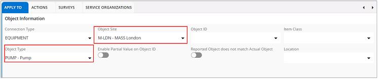 In the Filters tab, enter the filter criteria for the objects. The relevant eForms can be added in the Surveys tab. These Surveys need to have the Workflow Type - Object Information.