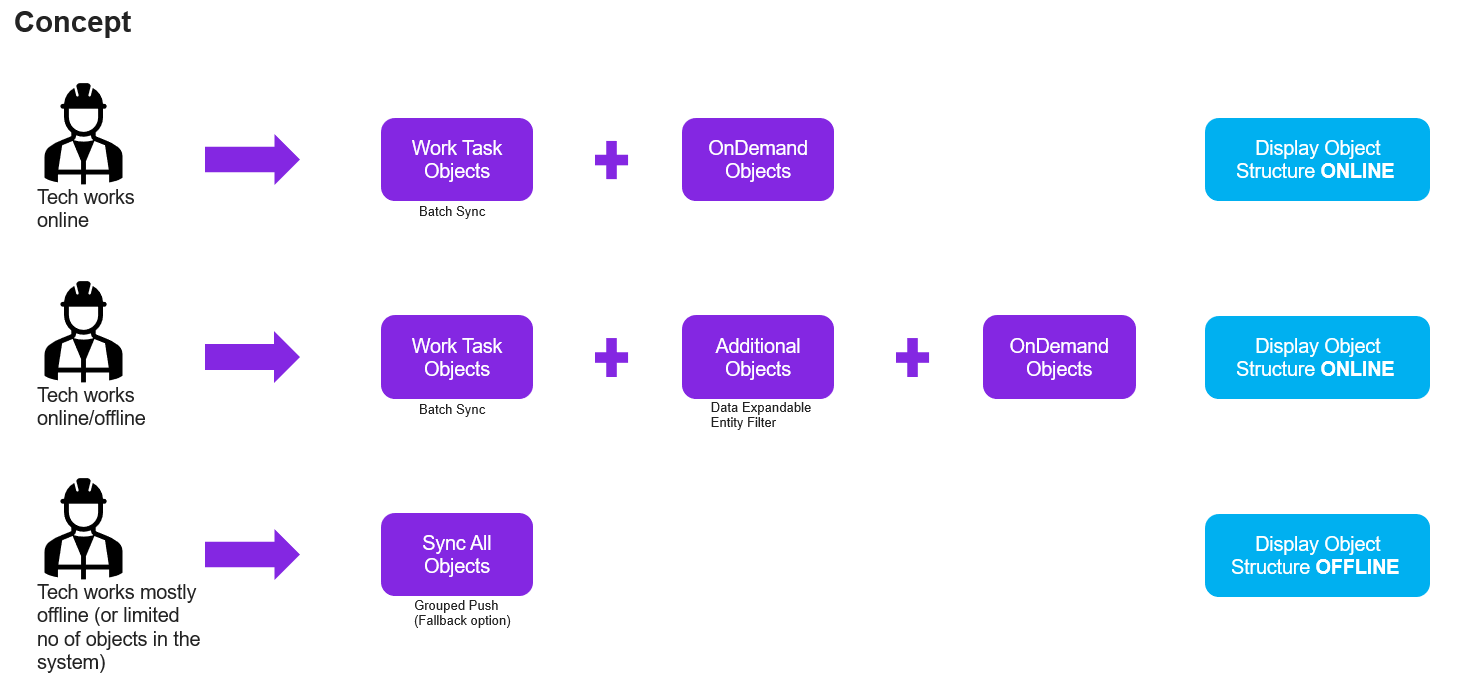 A limited number of objects on user-allowed site/s will be synchronized to the mobile client. By default, only objects related to user-assigned work tasks will be synchronized but it is possible to use the OnDemand object download mechanism on the device to download further objects or to expand the default data set through an entity filter. Same as for Grouped Push, this setup synchronizes related supporting data such as Technical data, Measurements, Service Contracts, etc..