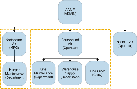 Organization hierarchies provide basic filtering for users. In the diagram below for example, a user who belongs to the sub-organization Southbound Air sees only the departments, crew, and users below Southbound Air. Also, when adding required skills to a maintenance task, users that belong only to the Southbound Air organization, can select only those skills that belong to Southbound Air.