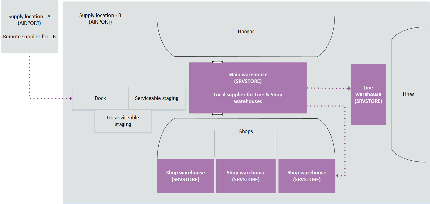 To replenish stock for a warehouse location, you can set stock levels so that Maintenix automatically generates stock distribution requests to transfer inventory from the supplier location to the warehouse to be replenished. In most cases, the main warehouse is the supplier for the line warehouse and for multiple shop warehouses.
