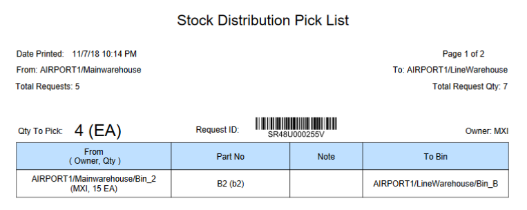 The stock distribution request pick list is a report that shows a list of stock distribution requests, and information about the warehouse locations and the items that should be retrieved or "picked" to fulfill them.