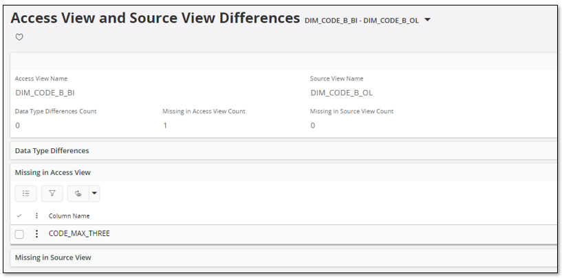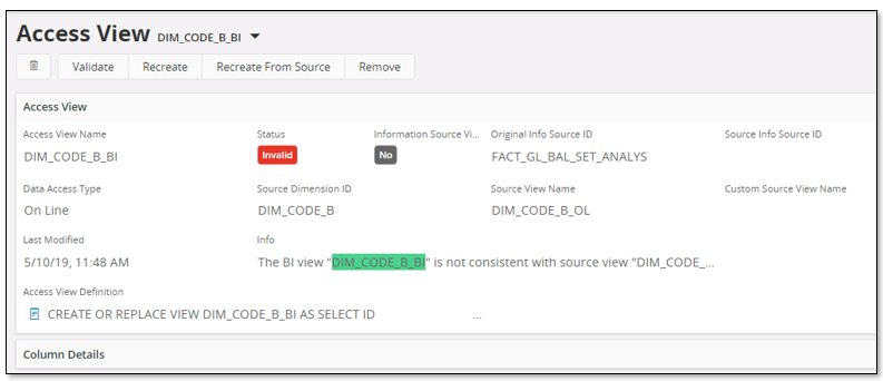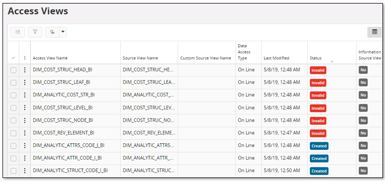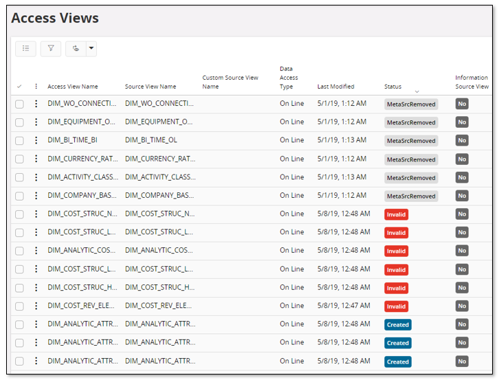 In the above example, there are some access views that have the status Invalid and some have the status MetaSrcRemoved. These views should be investigated.