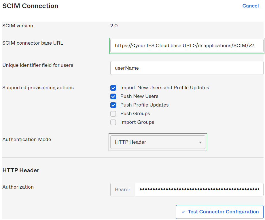 Set Authentication Mode to HTTP Header. Authorization field will require an Access Token. Normal access tokens have a limited lifetime and will expire shortly after being issued. This is circumvented by using an Offline Token, which is a type of refresh token. This token will not expire unless it is revoked. Offline Tokens can be generated in your IFS Cloud Application in the SCIM Access Manager page. Paste your generated token in the Authorization field.