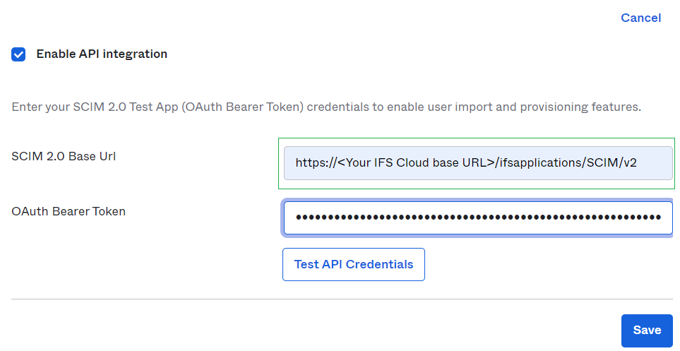 This configuration example describes how to set up User and Group provisioning from Okta to an IFS Cloud installation. Keep in mind that not all Identity Managers will look and work the same way, but a similar type of setup will need to be configured. The implementation of SCIM in IFS Cloud is done by exposing endpoints that the Identity Manager will communicate with. Only the main endpoint will need to be added to the Okta provisioning. The correct endpoints within the SCIM service will be used based on the type of request that is made from Okta (Get, Create, Update and Delete).