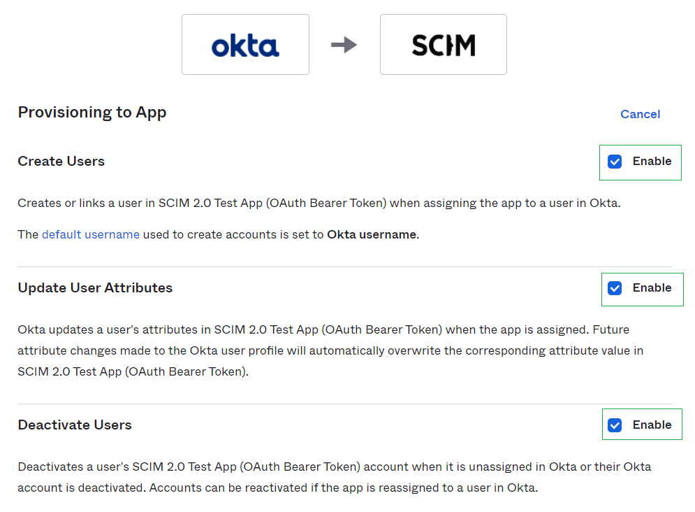 - Enable Create/Update/Deactivate Users in the “to App” settings.