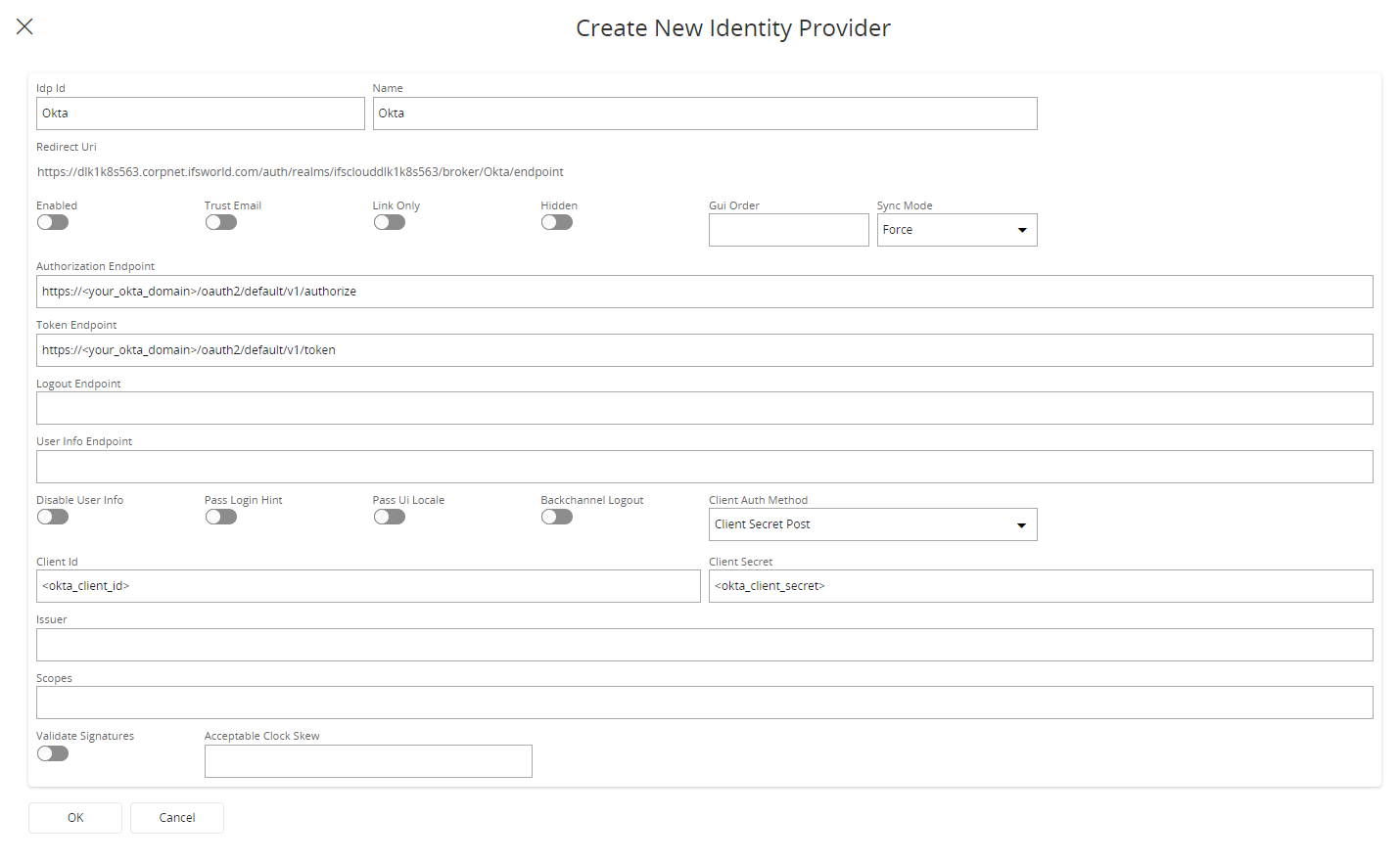 Validate Signatures | Another optional switch. This is to specify if IFS IAM will verify the signatures on the external ID Token signed by this identity provider. If this is on, the IFS IAM will need to know the public key of the external OIDC identity provider. See below for how to set it up. WARNING: For the performance purposes, IFS IAM caches the public key of the external OIDC identity provider. If you think that private key of your identity provider was compromised, it is obviously good to update your keys, but it’s also good to clear the keys cache |