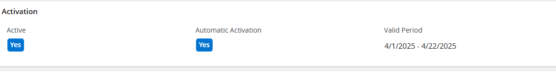 Note: If the user selects Automatic Activation = Yes, then specifying a date range for the Valid Period is mandatory.