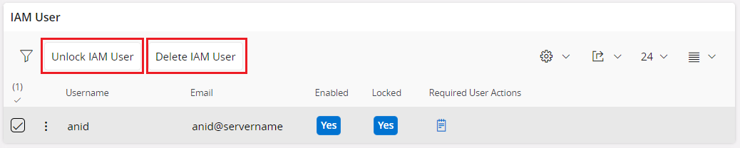Delete User: Allows administrators to delete the IAM User from the user details page itself. Deleting an IAM user will not delete the IFS User. After deleting, the user can log in again as the first time login attempt.