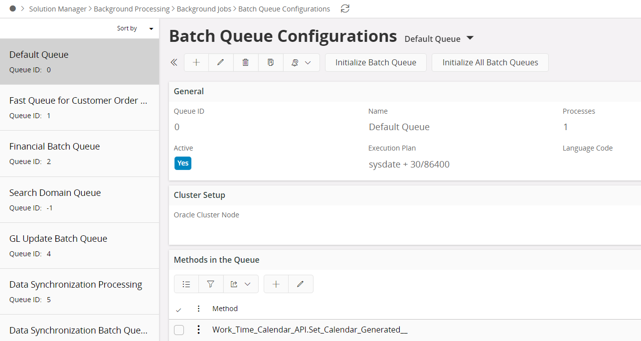 Batch Queues provide the ability to create dedicated queues for Background Jobs. A Batch Queue consists of a name, a number of processes to be started for the specific queue, an activation flag, an Execution Plan and the Methods that are assigned to that queue. The Methods in a Batch Queue is defined based on a PL/SQL Package and a Procedure in that package.
