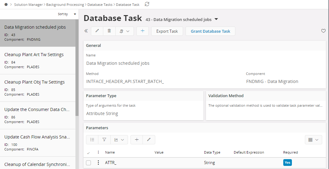Validation Method | Method that is used to validate the Database Task parameters. The method must take one parameter that is an IFS Message. |