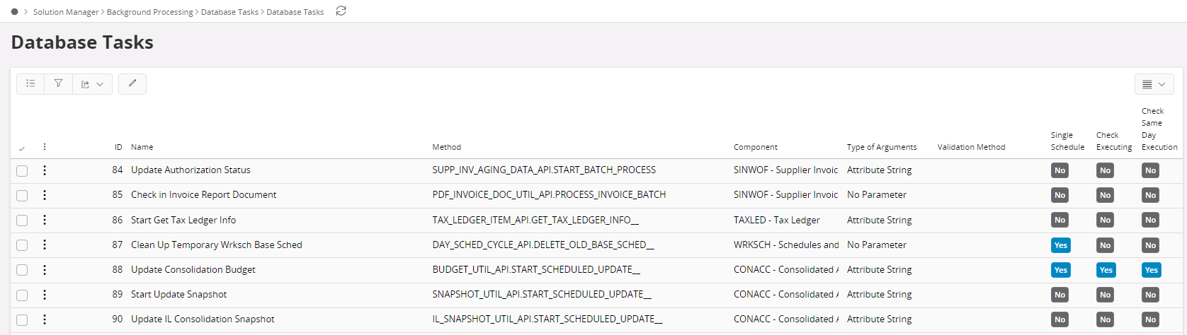 Method | The server method to be scheduled. In the format package.procedure. A method can only be connected to one Database Task. Note: Only procedures in _API packages are allowed when creating new Database Tasks. |