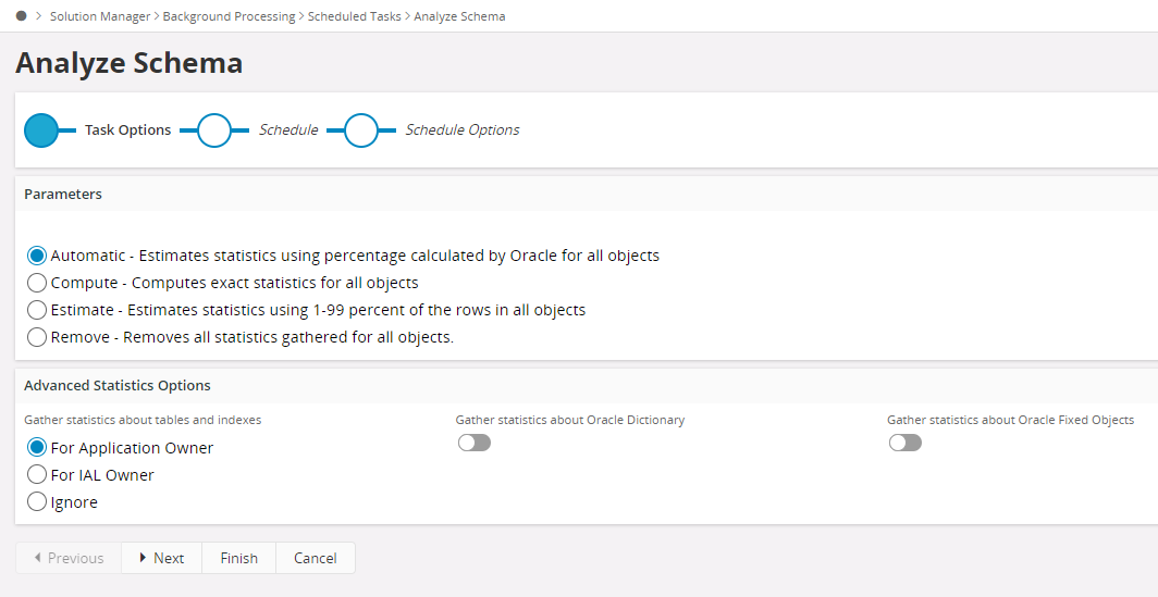 Analyze Schema is a scheduled task that analyzes the schemas that holds all tables and indexes installed for IFS Applications. See scheduled tasks for more information about execution plans and how they are executed.