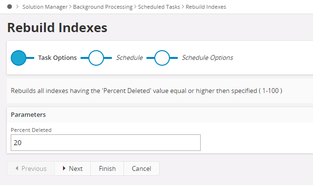Rebuild Indexes where deleted date (Percent Deleted) is greater than a given amount. This needs to be done when a lot of data has been removed from the tables, or there are performance issues with current indexes.