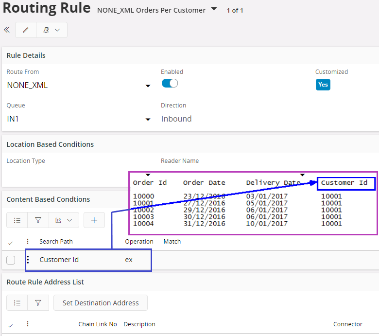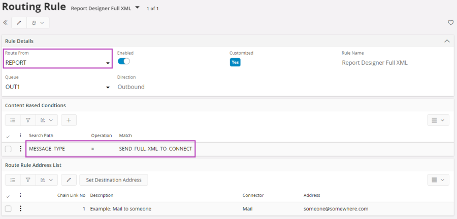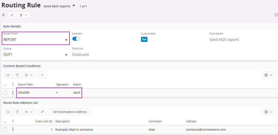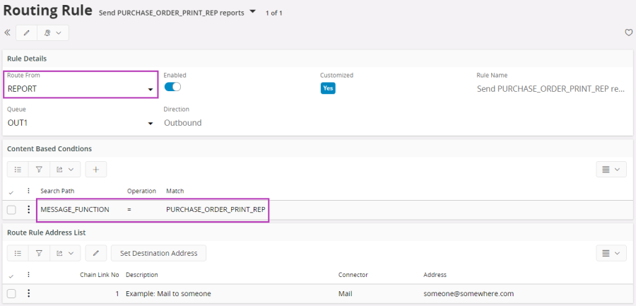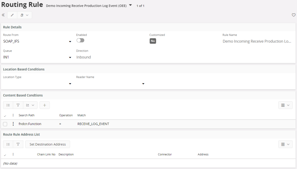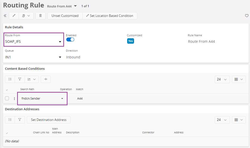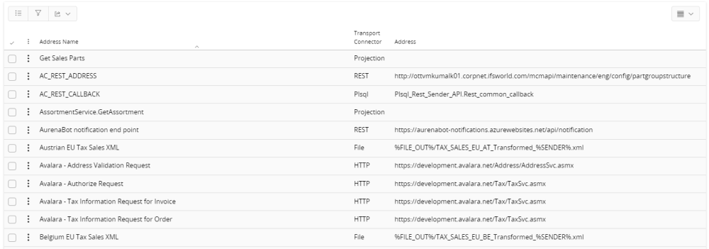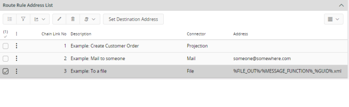 Shows a list of all Destination Addresses grouped in [address chain links](../../../../040_tailoring/300_extensibility/070_ifs_connect/message_routing/index.md#routing-address-chaining). A Destination Address defines a destination where the message is to be sent if all of the the conditions match.