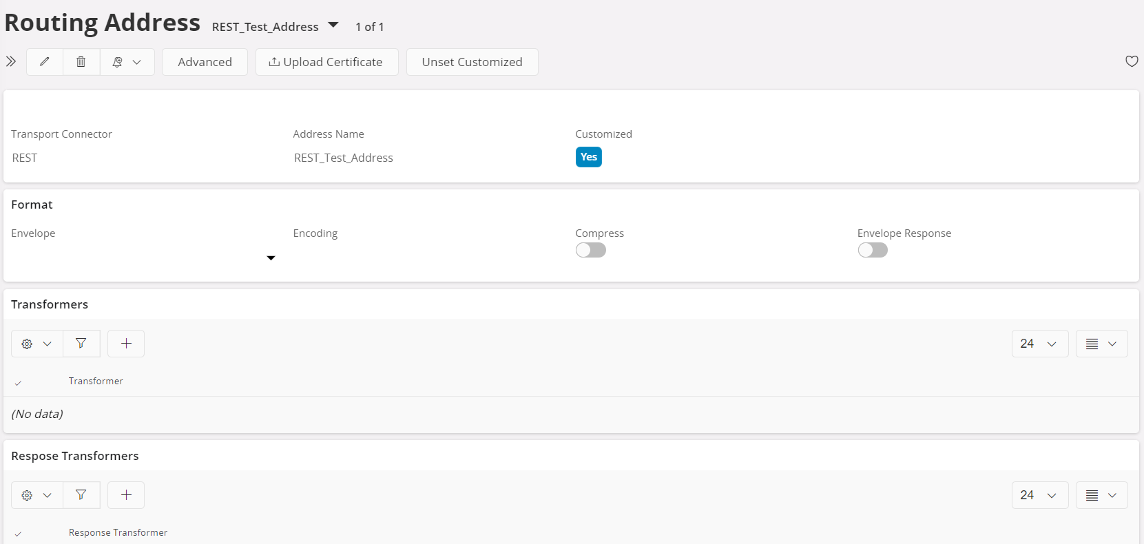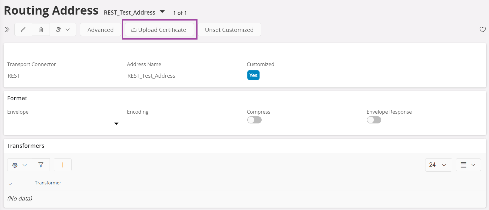 If the URL end point of a HTTP or REST routing address is secured and the SSL certificate of the relevant URL is not a trusted one, the SSL certificate can be uploaded through Routing Address view. This certificate should contain all the chain certificates including root certificates and intermediate certificates as a one file. If the SSL certificate is available for a routing address, a runtime keystore will be created with the uploaded certificate when connecting with the URL. This will ensure the secure communication between application and the URL end point.