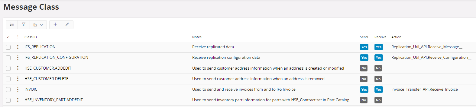 Message Class includes information about which messages that can be transmitted from the Out Message Box and received into the In Message Box. Columns Send