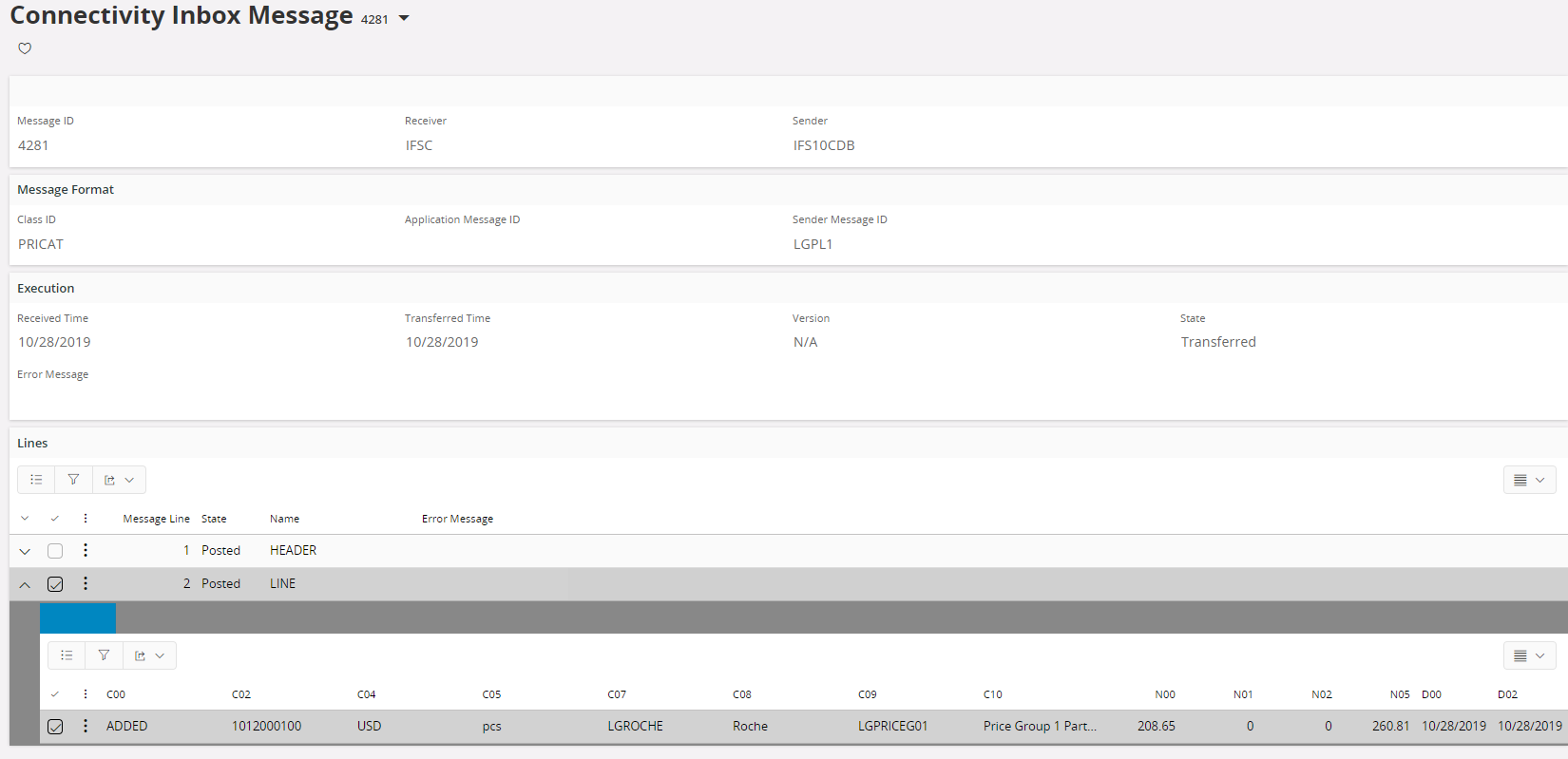The message lines can be viewed in a index list as the picture shows or in a grid. The index list gives you a good overview of the data in the message. In the 'grid' view mode you have functions like copying values, export values and also sort messages lines by clicking the column headers.